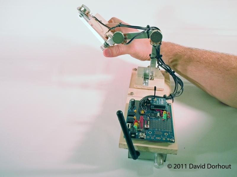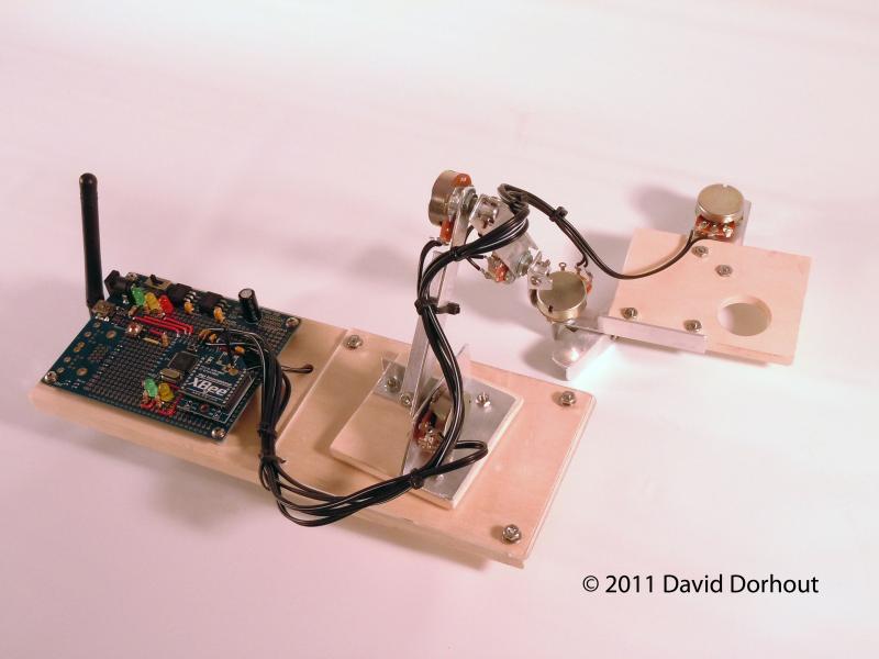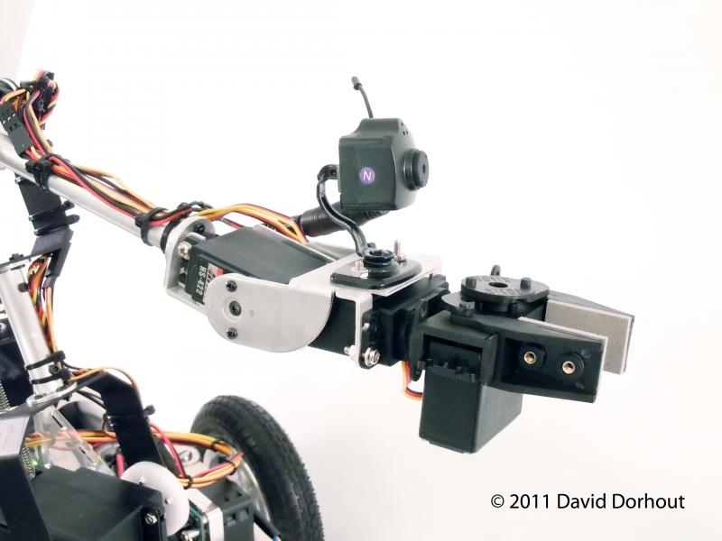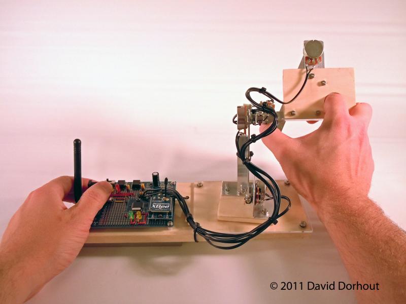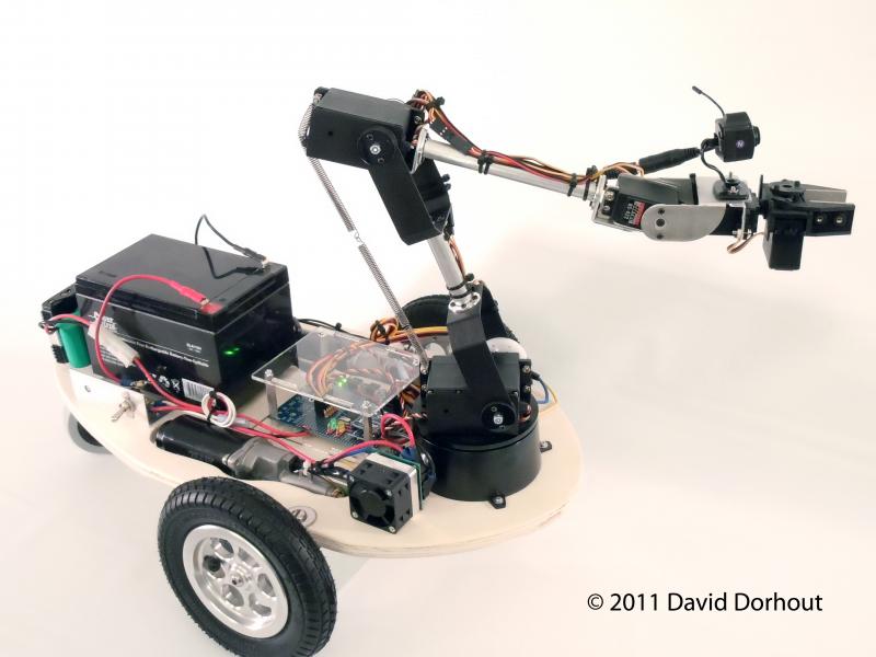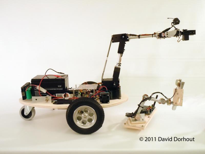 Nuntius is based on the same basic concept of those systems except it's a robot. The controller it a biomechanical input device that consists of a propeller proto board that measures the position of a 5 + gripper axis "mini arm" that you articulate with your hand just like you would if you were actually there. The propeller then send the data via a XBEE to the robot. The result is that the big arm on the robot mirrors the mini arm and you control the robot by looking through a wireless camera that's attached to the gripper. The movement of the robot is proportional to the direction and how far the arm is extended (or pulled back for reverse). The further the arm is extended, the faster it goes in that direction. The robot only moves while you're holding down a button on the proto board. This allows you to drive the robot around and then stop and examine something with just a button and the mini arm. You just plug it in and do whatever... weed the lawn, weed the garden, weed the driveway, take the dog for a walk... from the safety and comfort of your couch.